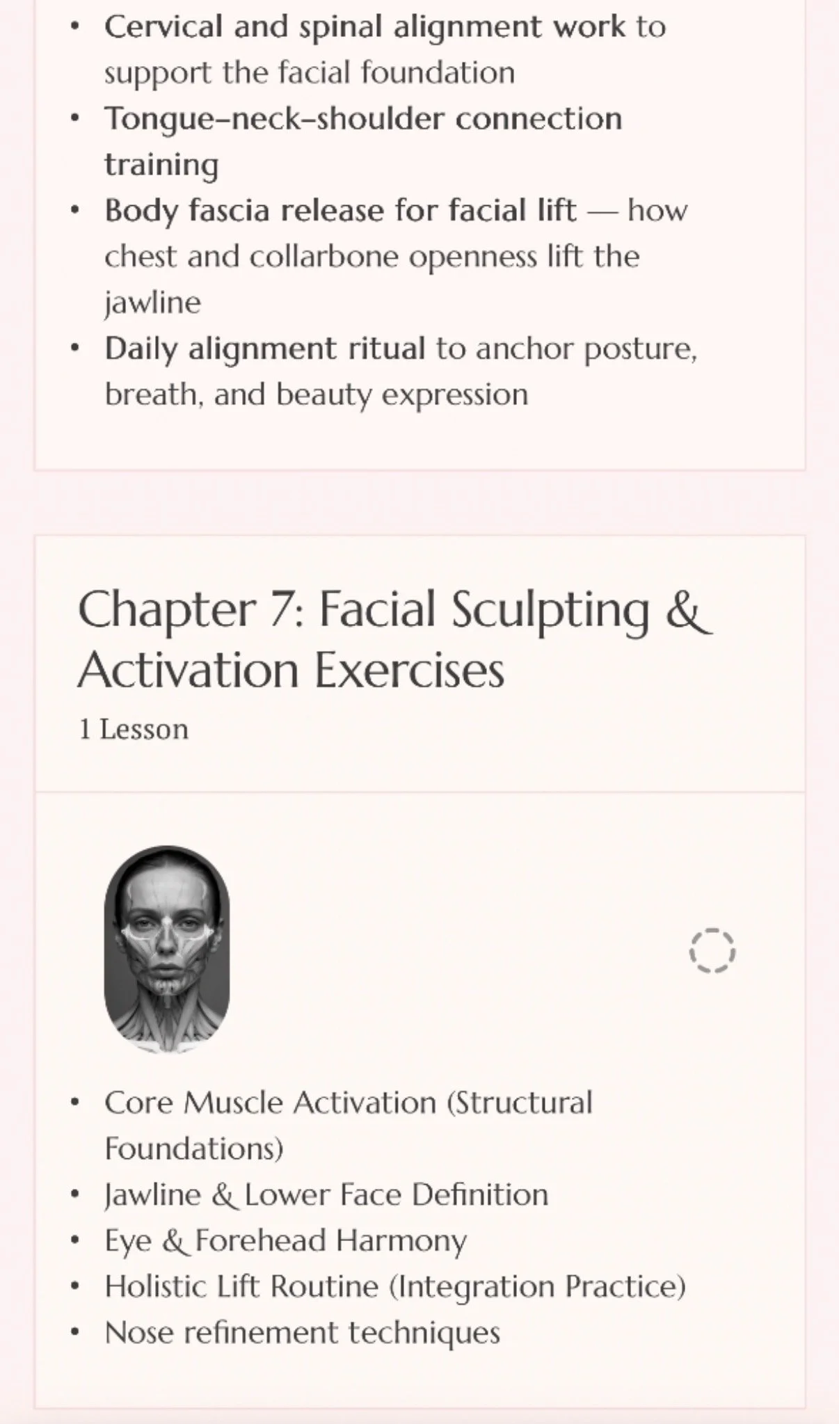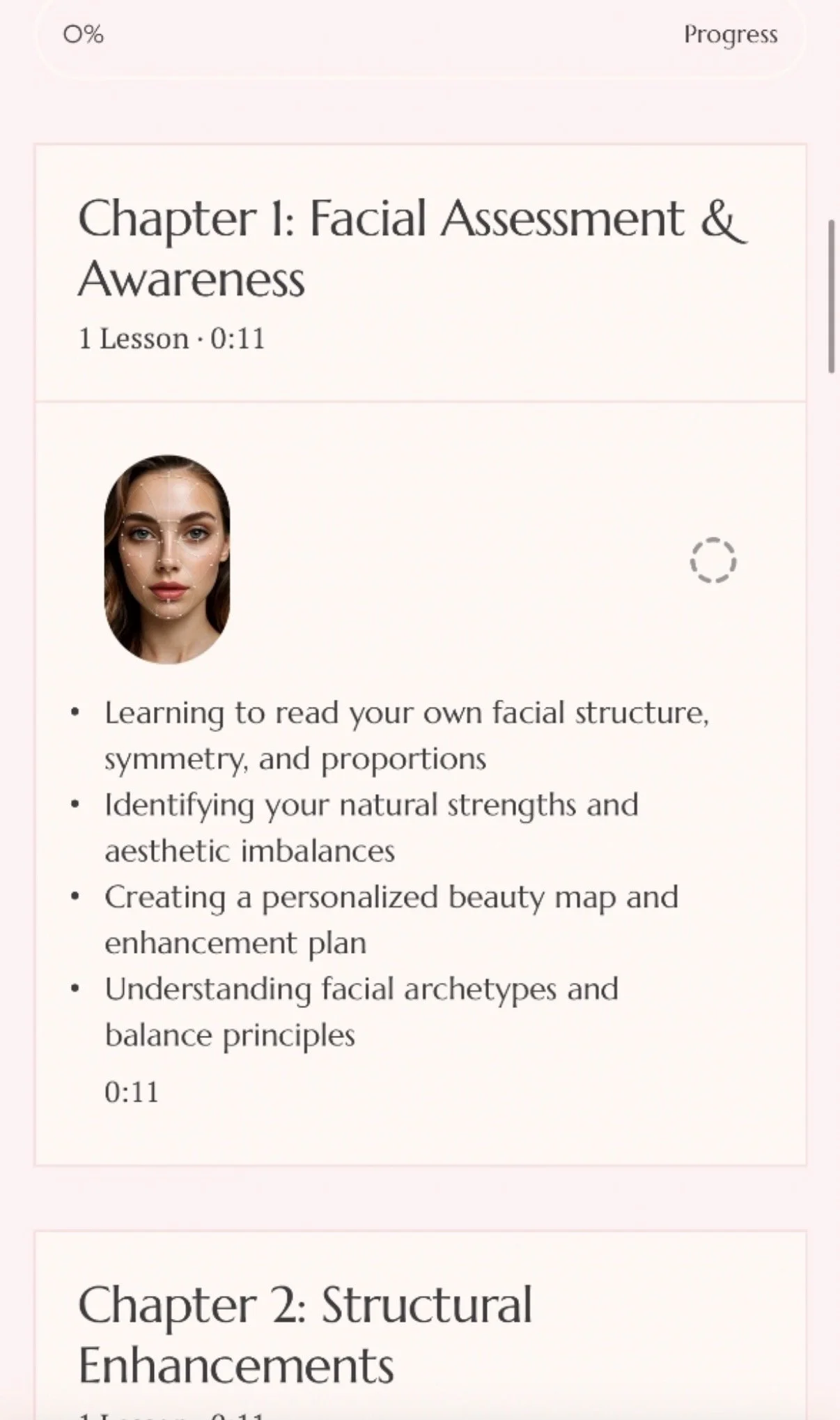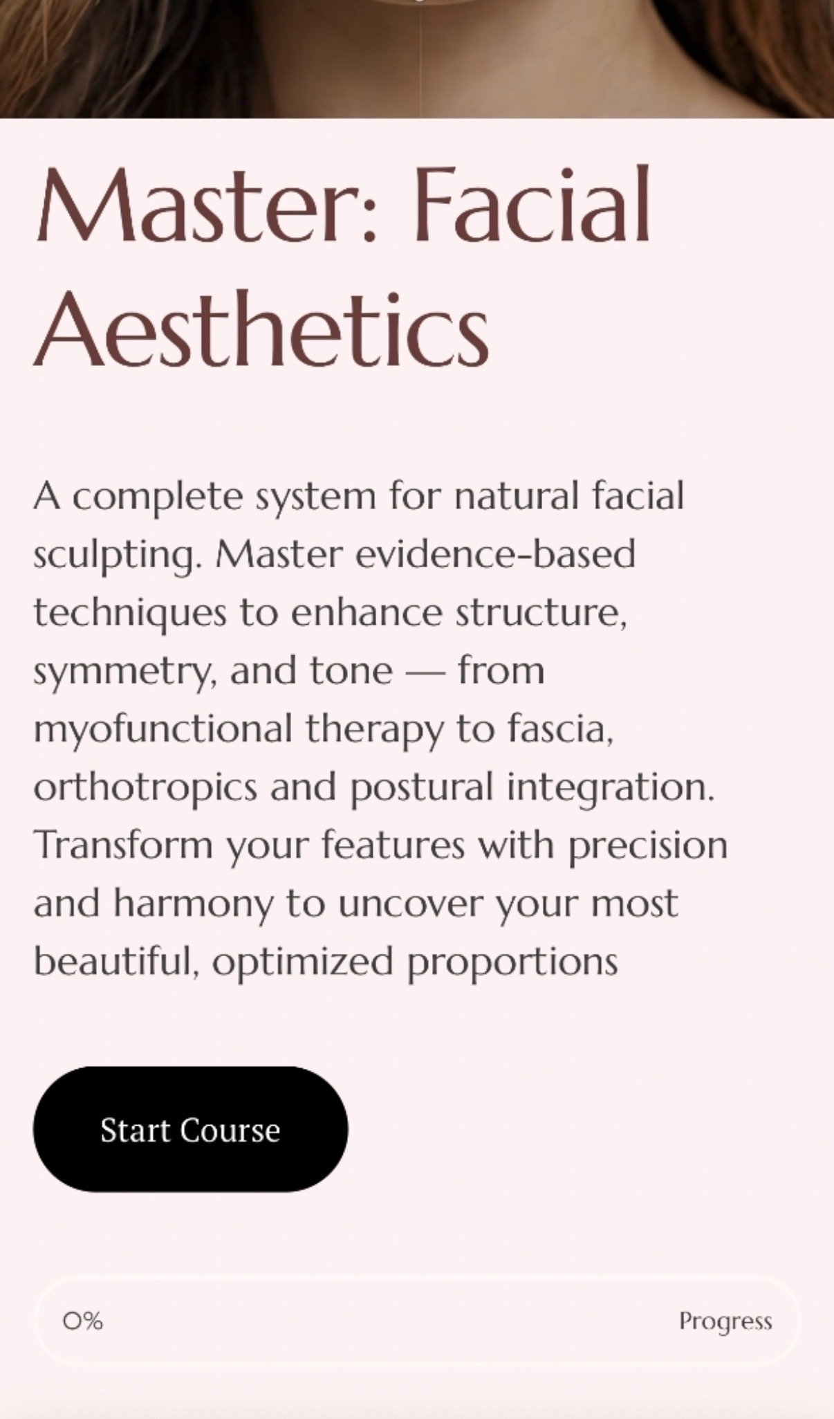 We begin with Health, Wellness, and Hormones, the true foundation of lasting beauty, helping you restore balance and glow from within. From there, we move into Facial Aesthetics, where you’ll discover science-backed methods to naturally enhance your features, improve facial symmetry, and refine your proportions using your own muscles and bone structure.